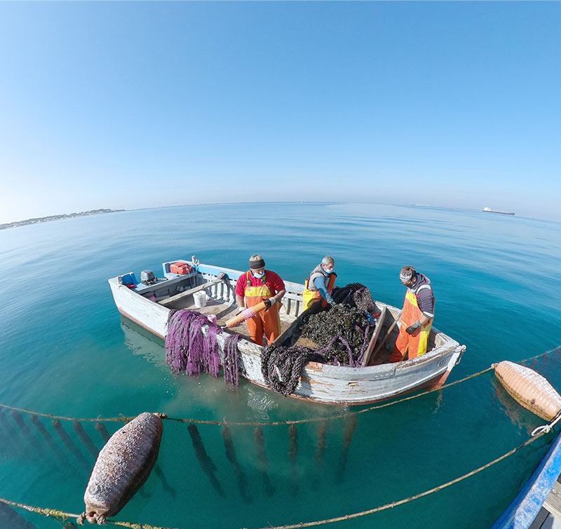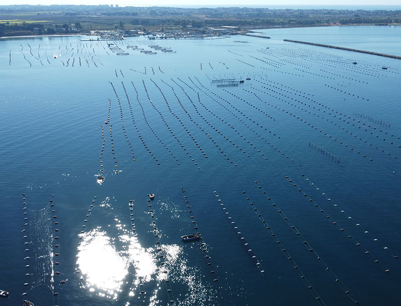 Produciamo cozze nate nel Mar Ionio da reimmergere in altri mari e alleviamo ostriche nel mare di Taranto.